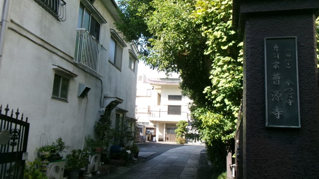 巨獄山曹源寺は曹洞宗に属し、天正16(1588)年に和田倉(千代田区)に開かれ、のち湯島天神に移り、明暦の大火(1657)の後、現在地に移転したと伝えられています。当地の住人雨合羽商の合羽川太郎(合羽屋喜八)という人物がいました。付近が水はけの悪い低地で雨が降ると洪水となり、人々が困窮していたところ、喜八は私財を投じて堀割工事(水はけ工事)を行いました。かつて喜八に助けられた隅田川の河童が工事を手伝いました。この河童を見かければ商売繁盛したといいます。文化11(1814年)喜八が葬られ、墓と伝えられる石碑があります。この伝承が「かっぱ寺」の通称の由来です(現地案内板等を参考に)。