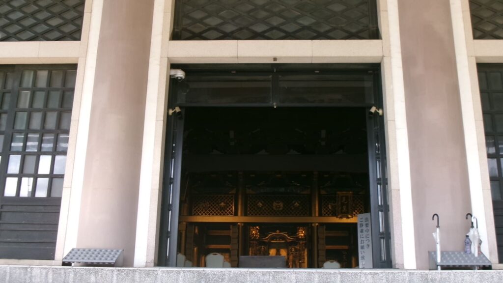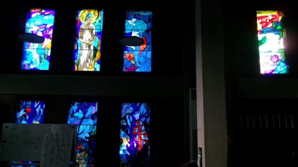 山門には右に日眼祖師、左に本額寺とあります。中に入ると人はおらず、本堂の扉を開けて中に入ってお参りしてよいとの貼り紙がありました。扉を開けると、見事なステンドグラスをみることができます。