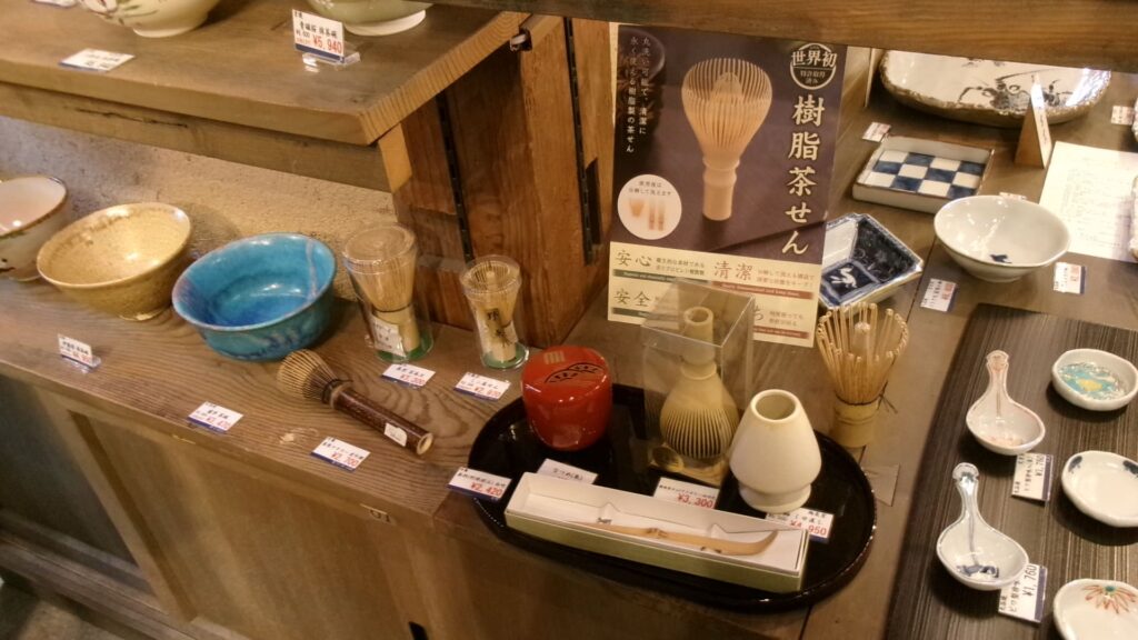 国内の各産地窯元より日々の食卓を彩る季節感ある器を集めています(公式HPより)。店舗は1階と2階にあり、多くの観光客でにぎわっていました。お茶の道具もありました。茶筅などはほかのお店にも多く売っており、インバウンドの方の人気がうかがえます。