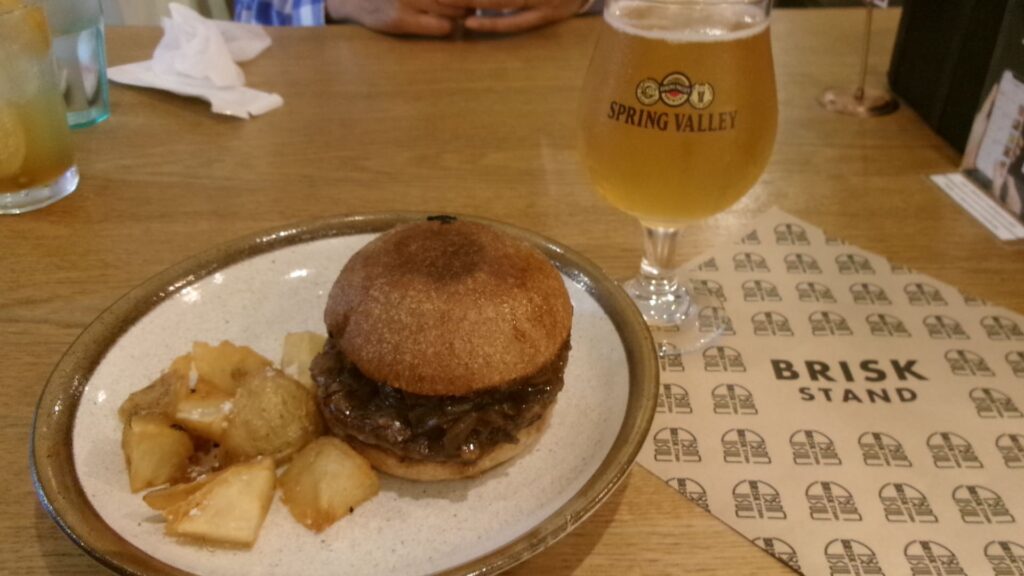 「グルメバーガー日本一決定戦 バガチャン2025」で優勝とのことで、待ち行列が発生していました。予約してよかったです。クラシックハンバーガーとビールをいただきました。見た目は小さいように見えましたが食べてみると食べ応えがありました。
