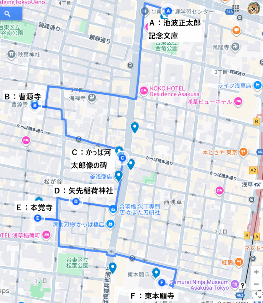→ A:池波正太郎記念文庫 → 徒歩550m B:曹源寺(かっぱ寺) → 徒歩250m C:かっぱ河太郎像の碑 → 徒歩200m D:矢先稲荷神社 → 徒歩60m E:本覚寺 → 徒歩400m F:東本願寺