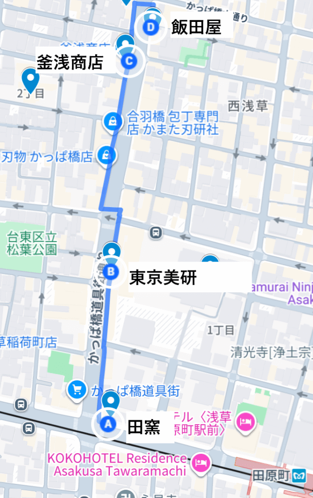 東京メトロ 銀座線「田原町駅」下車徒歩3分 和の器 田窯 → 東京美研 → 釜浅商店 → 飯田屋