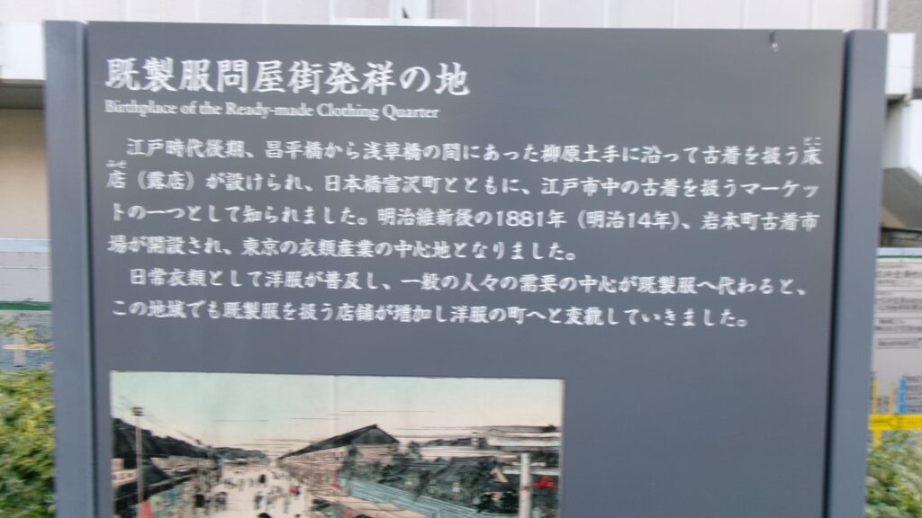 江戸時代後期、昌平橋から浅草橋の間にあった柳原土手に沿って古着を扱う床店(露店)が設けられ、日本橋富沢町とともに江戸市中の古着を扱うマーケットの一つとして知られました。明治維新後の1881(明治14)年、岩本町古着市が開設され、東京の衣類産業の中心地となりました。日常衣類として洋服が普及し、一般の人々の需要の中心が既製服へと変わると、この地域でも既製服を扱う店舗が増加し洋服の街へと変貌して行きました。やがて大量生産のもと一部流行遅れの品物や規格外れの商品が数多く出回るようになったため、それらを文字通り“家族向け”に格安の値段で提供したのがファミリーバザールの始まりです(由来碑のある和泉橋南東児童公園の隣に本部が置かれています)。